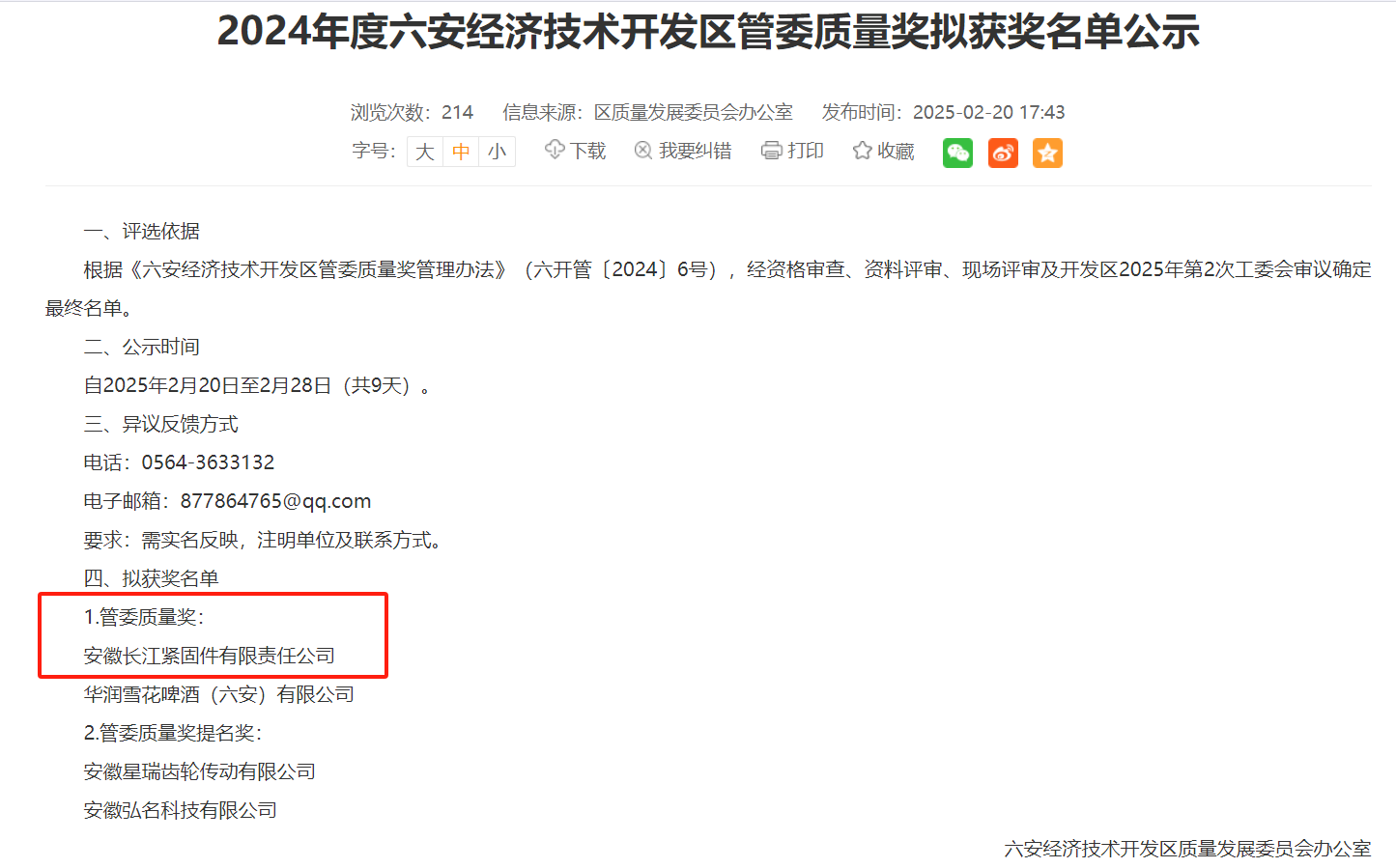 長江緊固件憑借卓越的產品質量和卓越的管理水平,榮獲2024年度六安經濟技術開發區管委質量獎。這一殊榮是對長江緊固件多年來堅持質量立企、創新驅動發展的充分肯定。